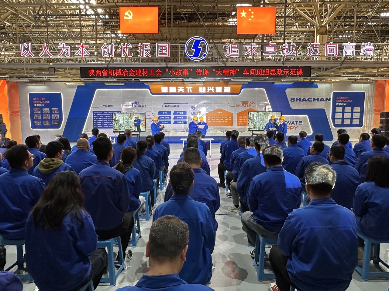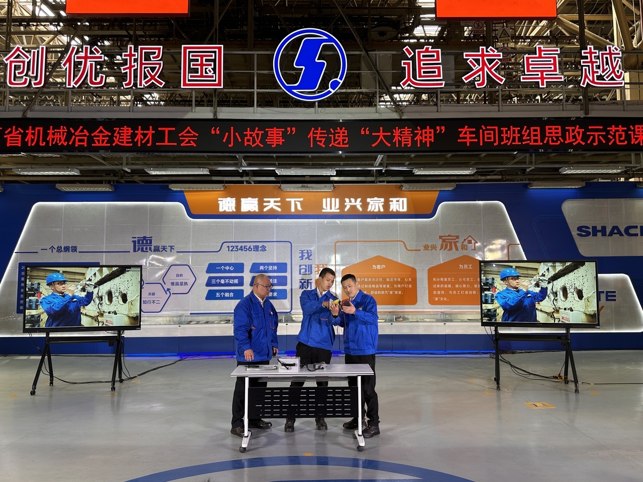 这是陕西省机械冶金建材工会今年在全系统开展“小故事”传递“大精神”车间班组思政课示范课活动现场的一幕。活动以“践行‘三个精神’ 陕汽工人有力量”为主题,吸引了该企业百余名高技能人才、一线职工代表等参加。