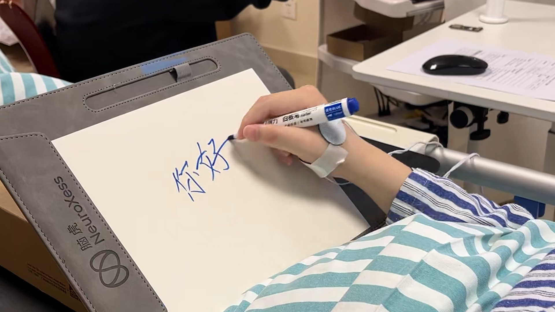 患者借助 BCI-FES 技术实现自主握笔写字 受访者 供图